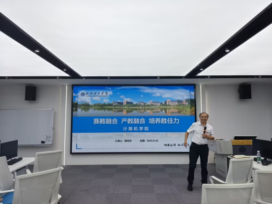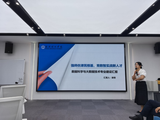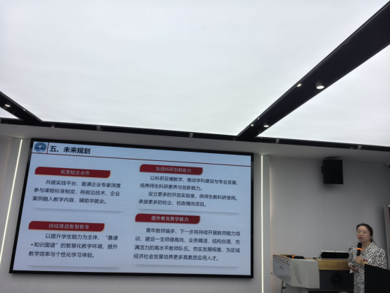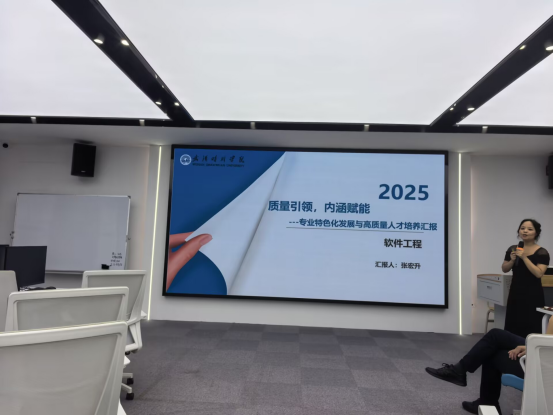 活动首阶段,四位专业负责人依次登台进行专业建设汇报。计算机科学与技术系主任裴浪以"夯实基础、强化实践"为主线,通过“六大举措”提升教育质量与学生培养水平,展示了该专业以学生能力提升为目标,在学科竞赛获奖数量的突破性成果;软件工程系主任张宏升以“质量引领,内涵赋能”为主线,重点介绍了实践教学改革成效,通过“三划分三加大”措施,完善实践教学体系;数据科学与大数据系主任谢倩则围绕"产教融合"特色,分享了与中软国际共建课程与实验室的实践经验;人工智能系主任李珊枝聚焦新工科建设,汇报了复合型人才培养模式的探索成果。